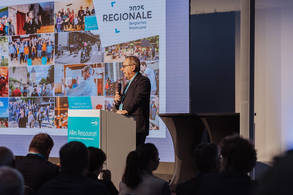 Gleichzeitig betonte er, dass man die Grenzen des Planeten überreizt habe und die nötige Umstellung von einer linearen Wirtschaft zu einer Kreislaufwirtschaft noch viel Arbeit erfordere. Die Umsetzung hierfür müsse vor Ort erfolgen, so der Minister. Für ihn stelle das Bergische RheinLand die zentrale Frage unserer Zeit. Es gehe um einen Kulturwandel und ein Umdenken: Müll sei ein wertvoller Rohstoff, der wiederwendet und verwertet werden müsse. Die REGIONALE stoße mit ihren Projekten diesen Wandel an und zeige, wie man innerhalb der planetaren Grenzen lebt. Als Beispiele nannte der Minister neben der :bergischen rohstoffschmiede die REGIONALE-Projekte Bergische WasserkompetenzRegion :aqualon 2.0 und den Grünen Mobilhof in Bergisch Gladbach.